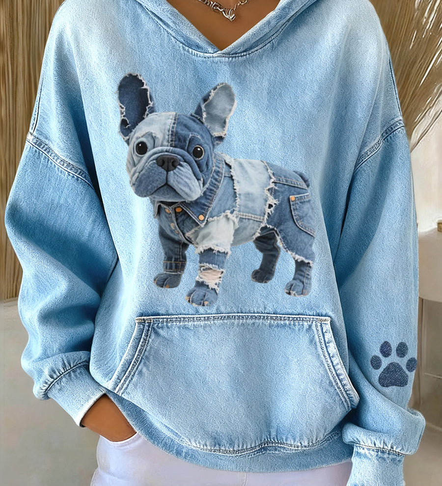 Blanca - Ženska dukserica s kapuljačom, francuskim buldogom, prugama i denim detaljima