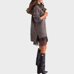 Ovaj set sastoji se od oversized džempera s visokim ovratnikom, mekanog, toplog i širokog kroja, dizajniranog za ležeran stil. Odjevnu kombinaciju upotpunjuje nježno čipkasto haljino s podstavom od tila na donjem dijelu, što dodaje pokret, šarm i onaj diskretni dodir senzualnosti koji transformira cjelokupan izgled.