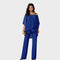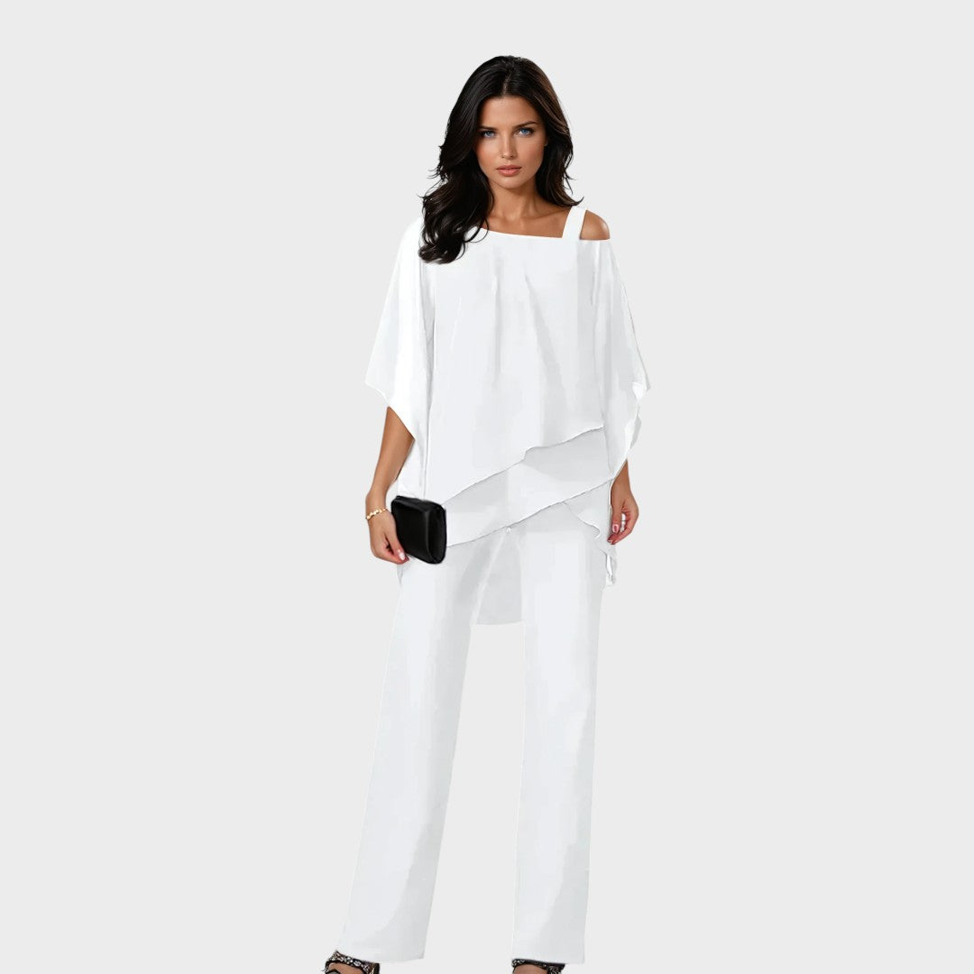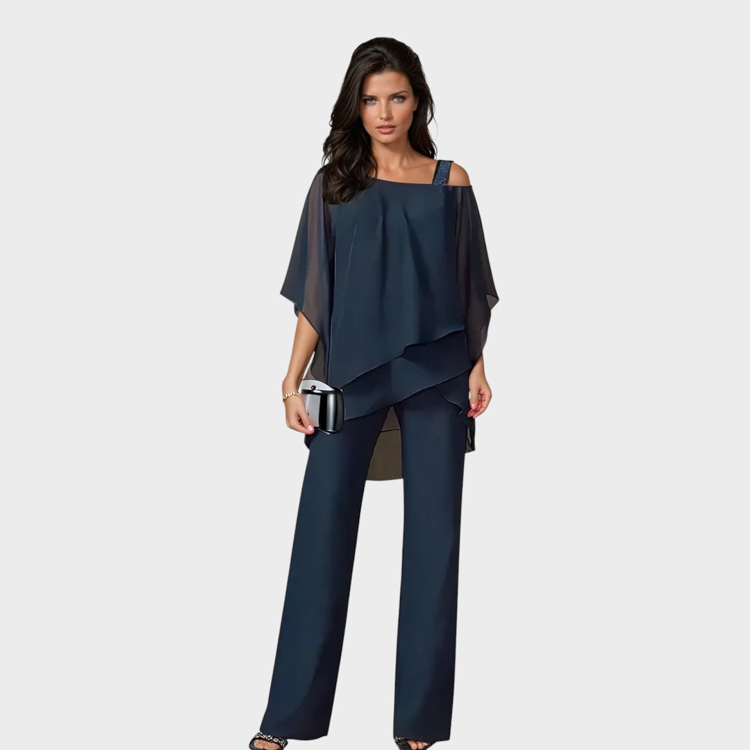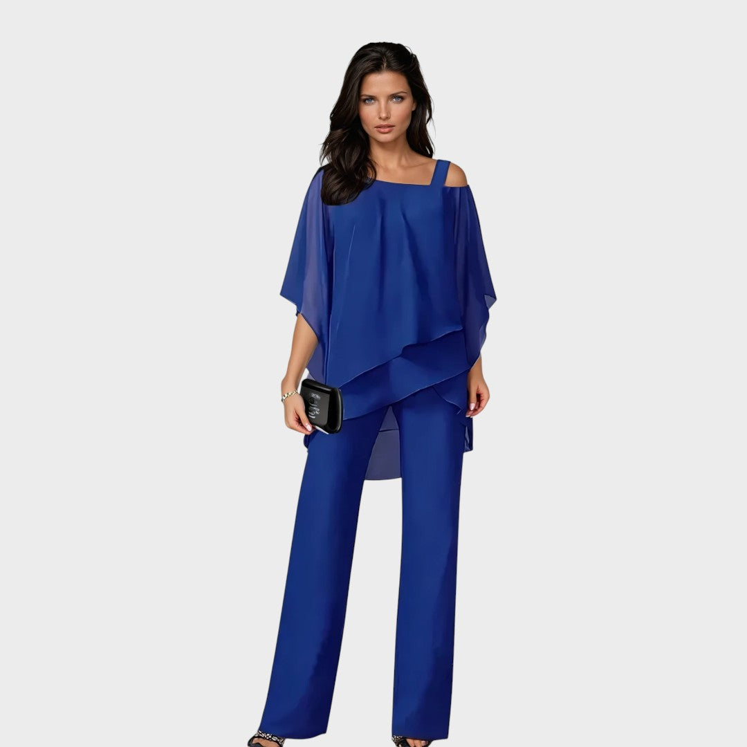 Ovaj sofisticirani komplet kombinira udobnost i profinjen stil u jedinstvenoj odjevnoj kombinaciji. Lepršava bluza s asimetričnim slojevima daje ženstvenu notu, dok ravne hlače pružaju eleganciju i slobodu kretanja. Savršen izbor za večernje izlazke, proslave ili poslovne događaje gdje želite ostaviti snažan dojam.