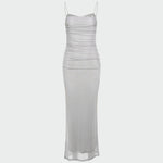 Impresivna maxi haljina s tankim naramenicama i čipkastim detaljima na dekolteu. Njena uska silueta ističe obline, dok prozračna tkanina na donjem dijelu donosi zračnu eleganciju. Idealna za večernje izlaske i posebne prigode.