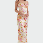 Impozantna maksi haljina s cvjetnim uzorkom koja isijava ženstvenost i eleganciju. Njeno usko krojenje ističe siluetu, dok dekolte s tankim naramenicama pruža osjećaj suptilne privlačnosti. Komad koji kombinira romantiku i luksuz, idealan za posebne prigode.