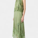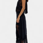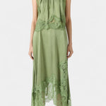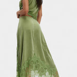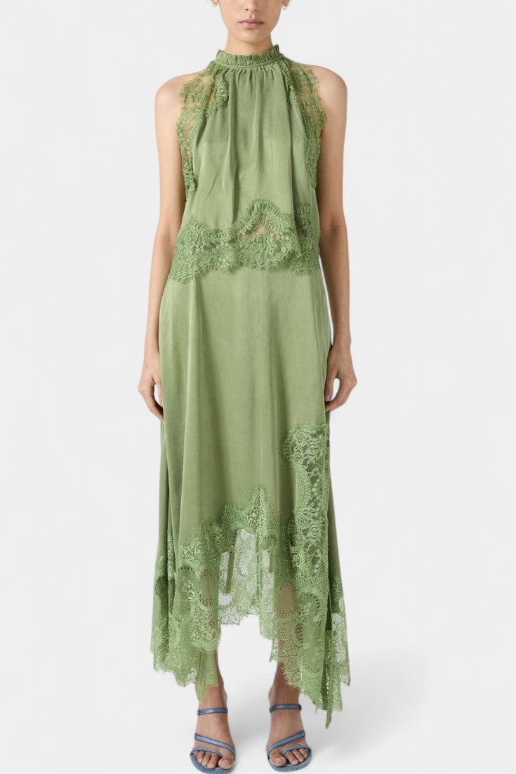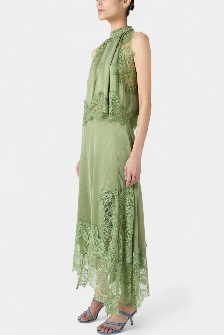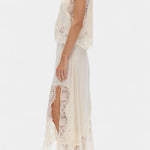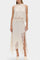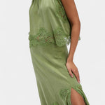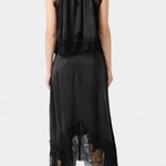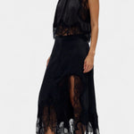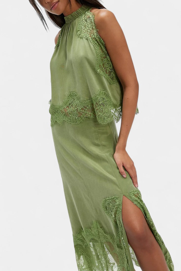 Set koji zrači pokretom, svježinom i bezvremenskom sofisticiranošću. Nada kombinira midi suknju s delikatnim čipkastim panelima i asimetričnom porubom koja donosi fluidnost u svaki korak, uz usklađeni top koji uravnotežuje eleganciju i modernost.