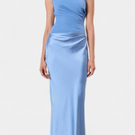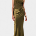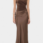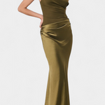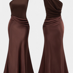 Dizajnirana da istakne s vječnom elegancijom, ova duga plisirana haljina kombinira sofisticiranost i prisutnost u svakom pokretu. Njezin asimetrični izrez na jedno rame donosi modernu i rafiniranu notu, dok delikatni nabori padaju s lakoćom kako bi oblikovali impozantnu i ženstvenu siluetu. Izgled osmišljen za trenutke koji zahtijevaju distinkciju i sigurnost.