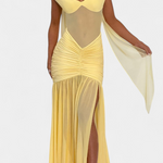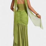 Elegantna zavodljivost u silueti koja teče s namjerom. Haljina Milica ističe se svojom ultra mekanom teksturom od milk svile i delikatnim sjajem koji miluje svaku krivulju. Njezin duboki V izrez i niska leđa stvaraju izduženu liniju, dok strateški nabrane detalje suptilno oblikuju. Visoki prorez dodaje dodir rafinirane odvažnosti.