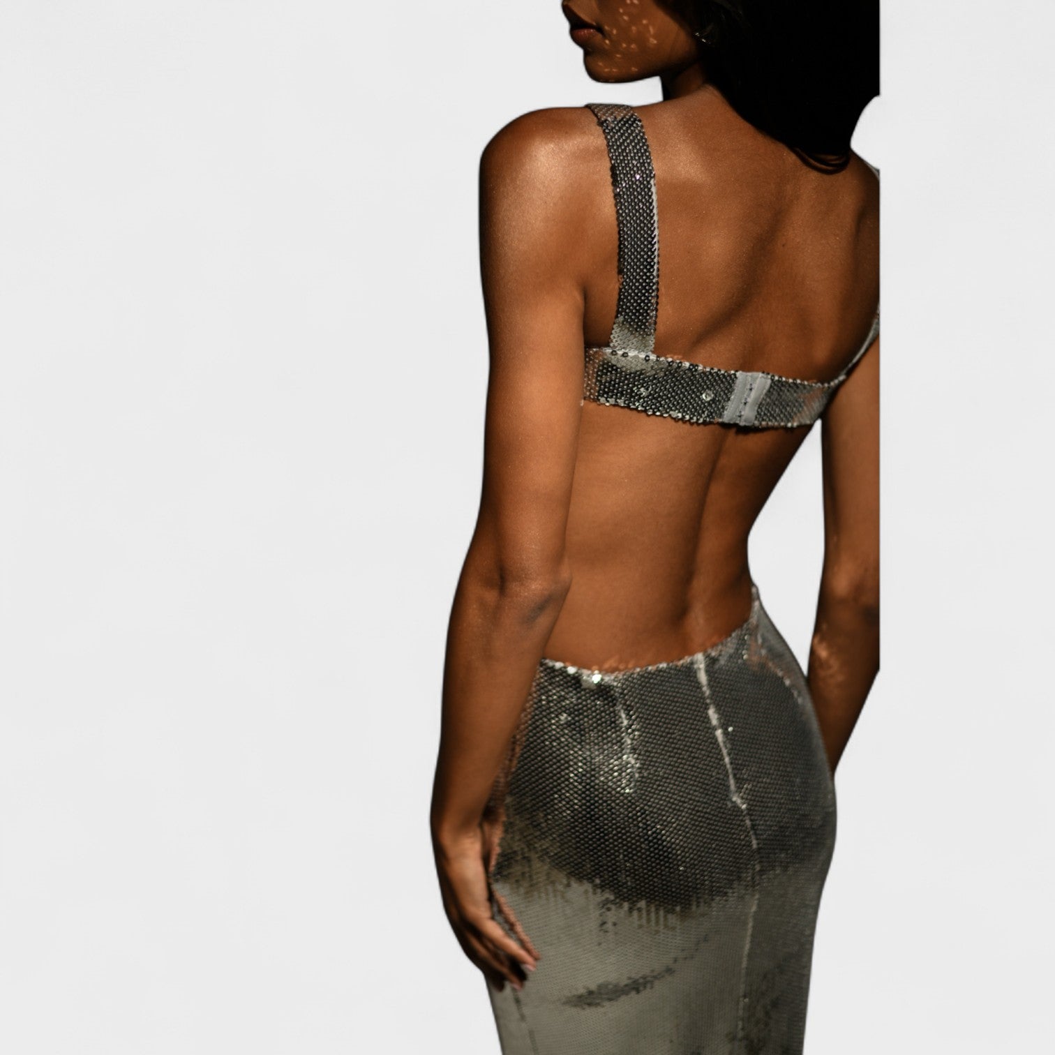 Haljina Kiara privlači pažnju od prvog trenutka. Njezina tkanina od šljaštećih šljokica odražava svjetlost s elegancijom, dok bočne proreze oblikuju siluetu sa senzualnošću. Dizajnirana za žene koje se usude sjajiti u svakom koraku.