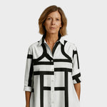 Istaknite svoj stil ovom upečatljivom haljinom s geometrijskim uzorkom. Kombinacija klasičnog kroja košulje i suvremenog dizajna čini je savršenim izborom za žene koje žele spoj elegancije i udobnosti. Lepršavi kroj omogućava slobodu pokreta, dok upečatljiv uzorak daje dašak umjetničkog i urbanog šarma.