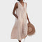 Ova elegantna haljina bez rukava savršena je kombinacija udobnosti i stila. Dizajnirana s V-izrezom i dugmadima sprijeda, haljina pruža ležeran, ali sofisticiran izgled. Prozračan kroj omogućava slobodu pokreta, dok praktični džepovi dodaju funkcionalnost. Idealna je za dnevne šetnje, odmore ili opuštena druženja.