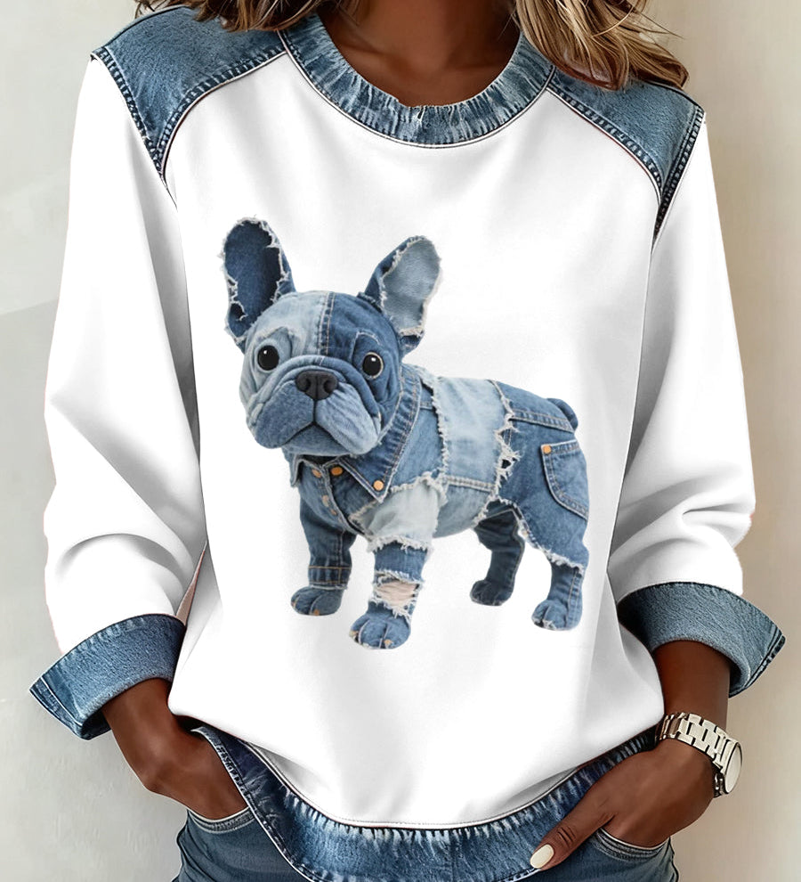 Alma - Ženska dukserica s patchworkom od denima u stilu francuskog buldoga