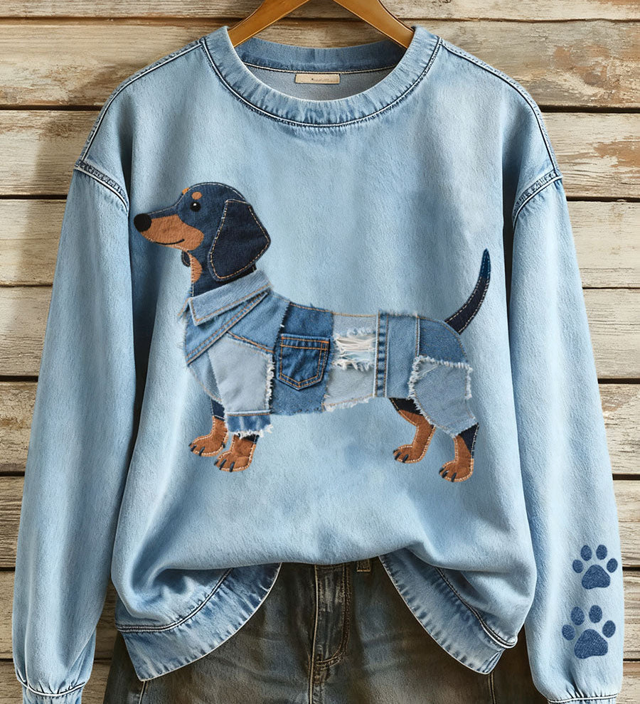 Sol - Ženska dukserica s patchwork denimom i motivom jazavčara