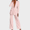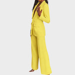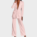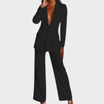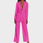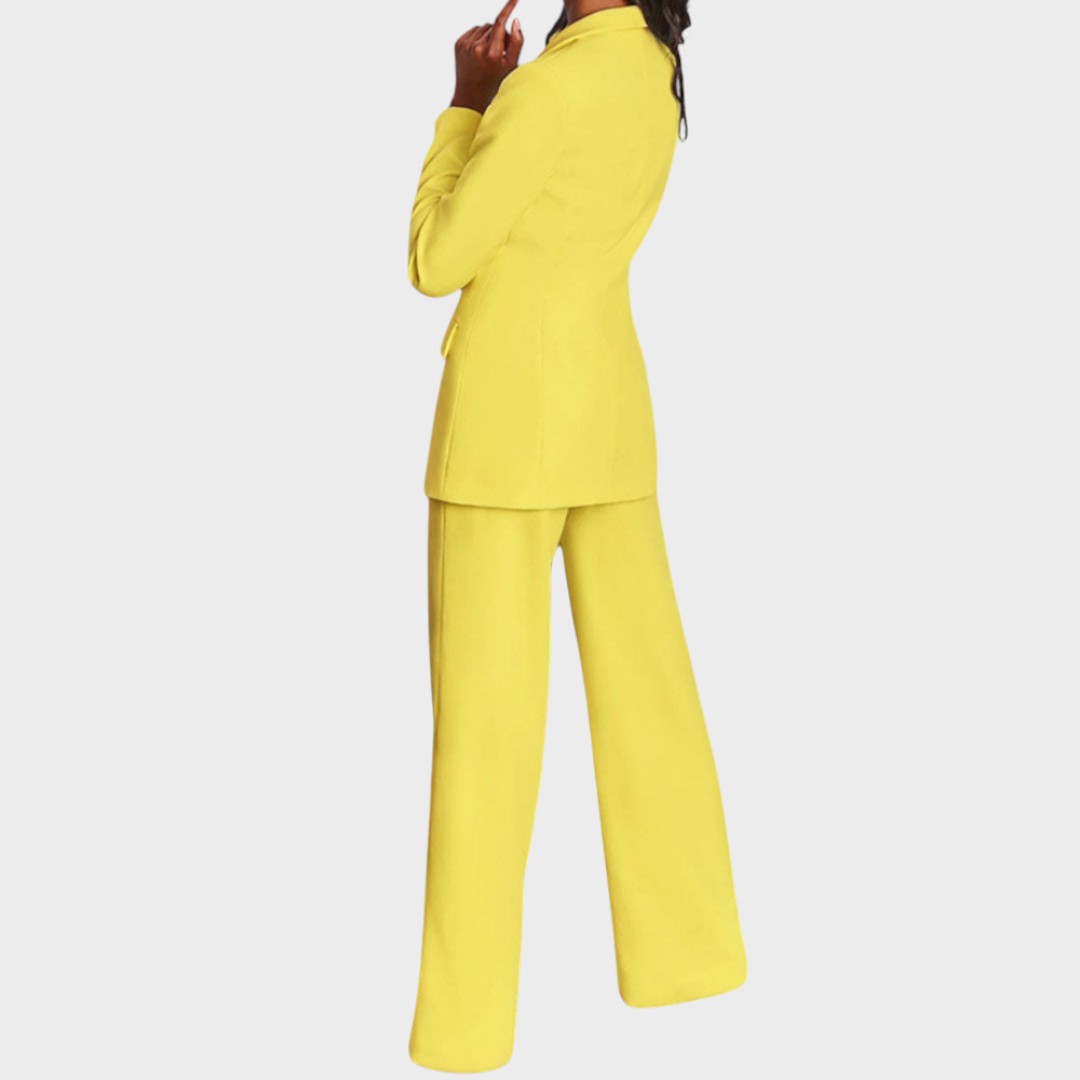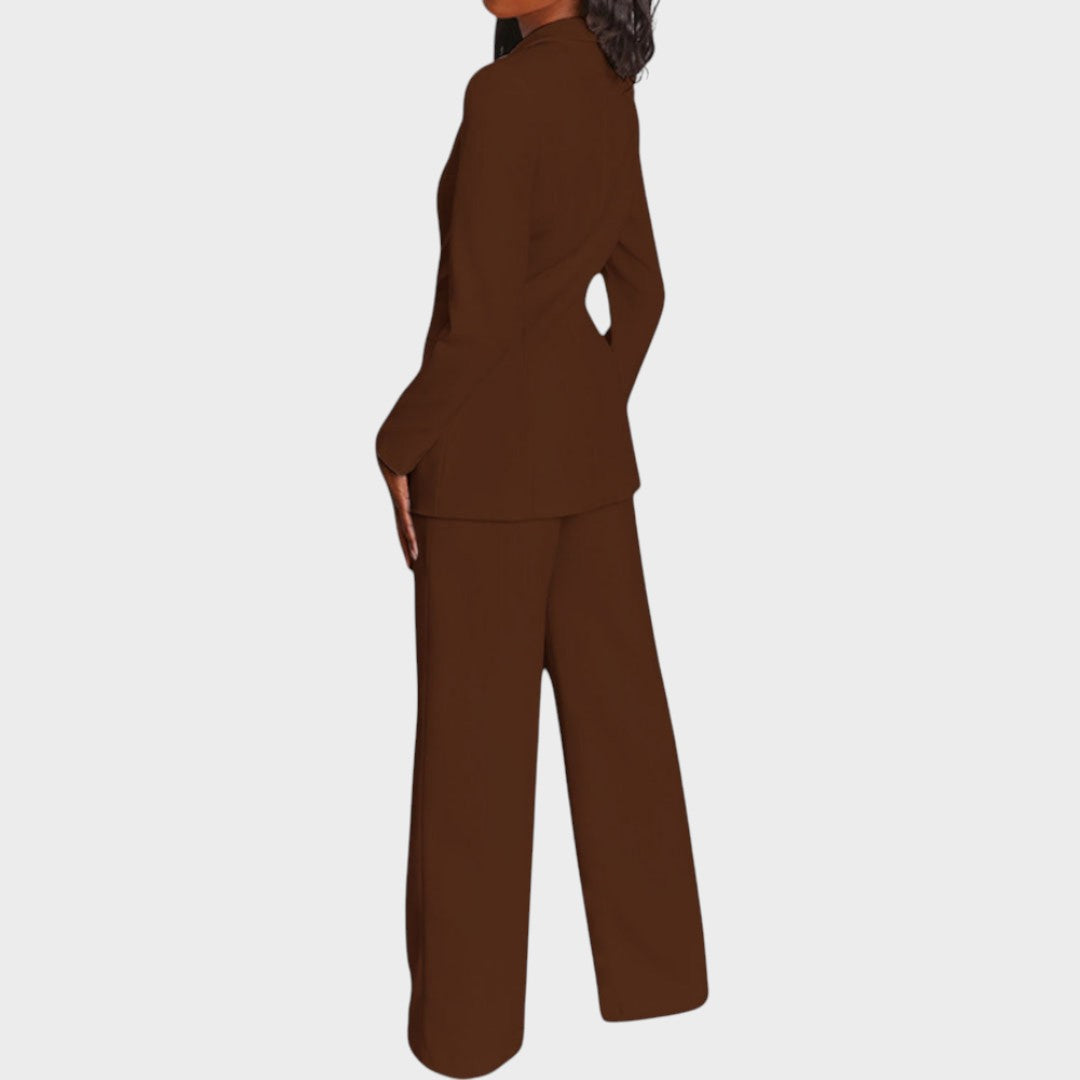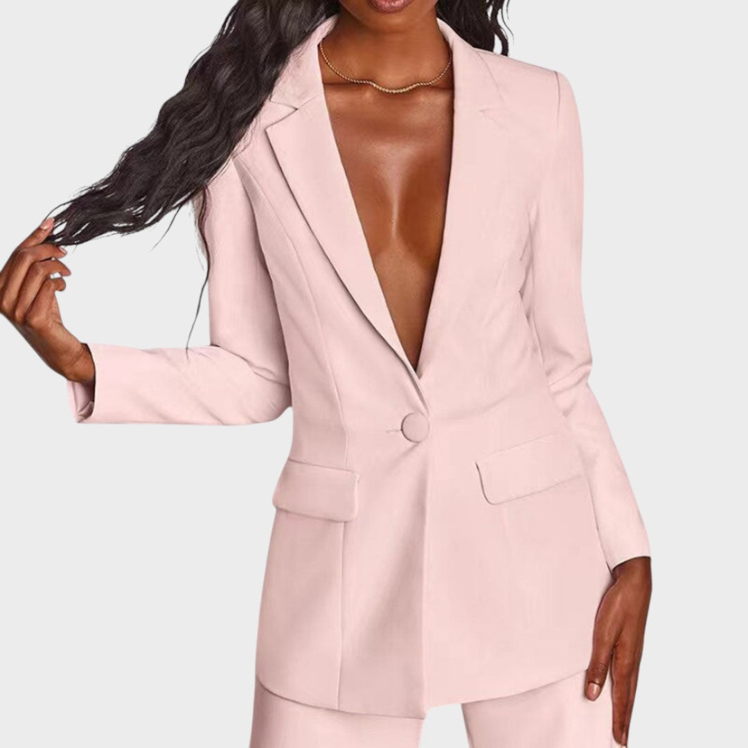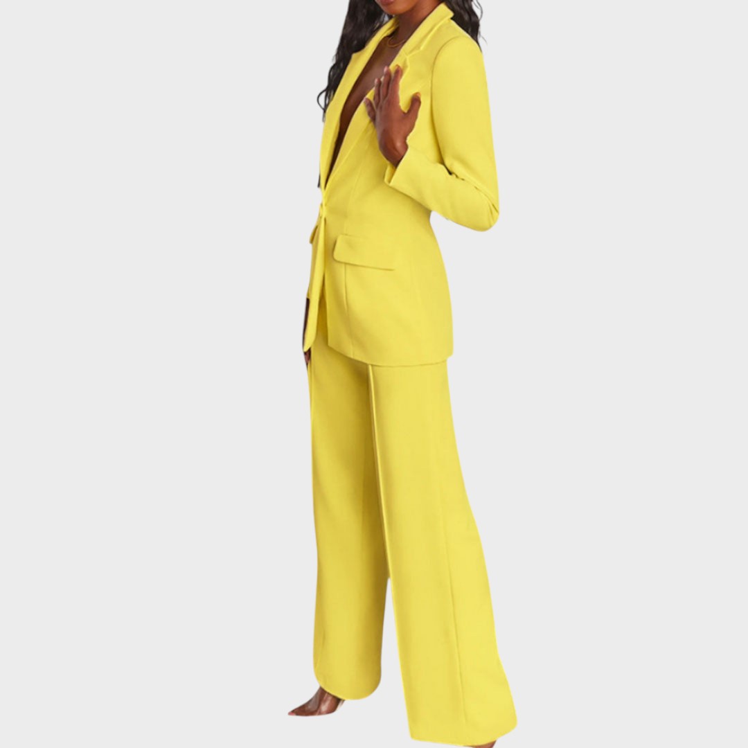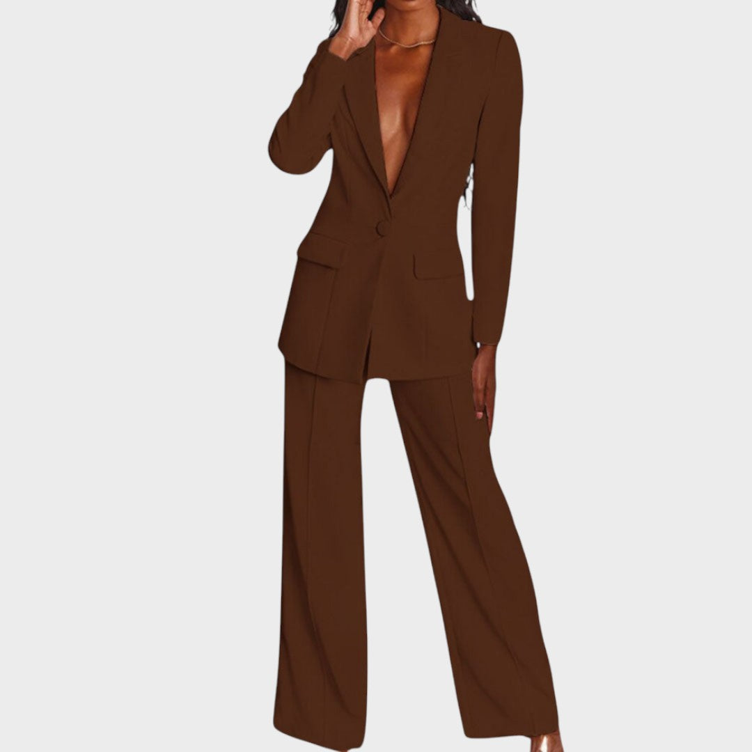 Žensko odijelo koje spaja profinjenost i moderan stav. Dugi blejzer sa špic-reverima, zatvaranjem na jedan gumb i džepovima s preklopom lijepo definira struk i vizualno izdužuje figuru. Hlače ravne, blago širokih nogavica s peglanom crtom osiguravaju čist, produžen profil i slobodu kretanja. Tkanina s lijepim padom pruža udobnost od jutarnjeg sastanka do večernog izlaska. Nosivo kao komplet ili odvojeno – jednako snažno u uredu, na eventu ili za svečanu večeru.