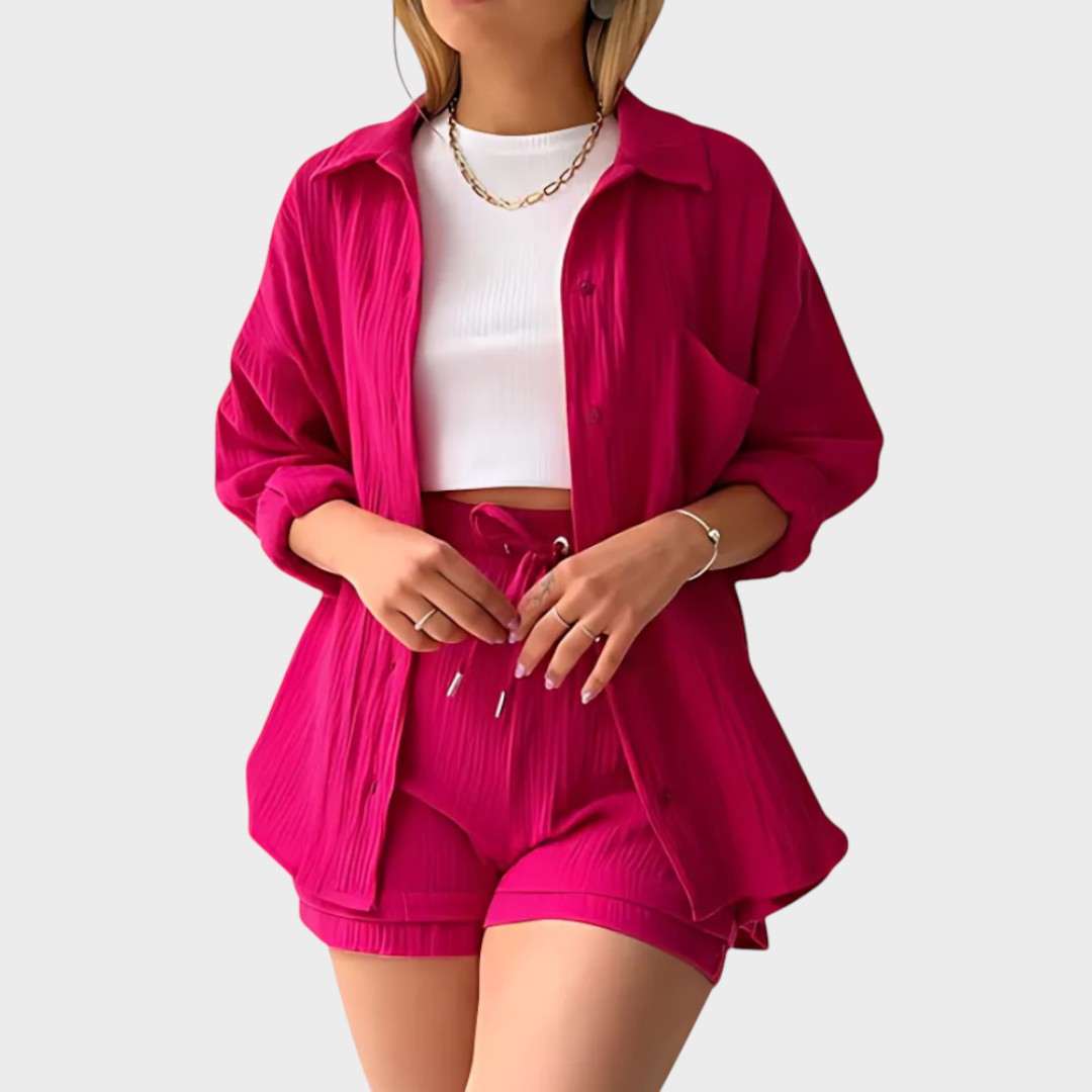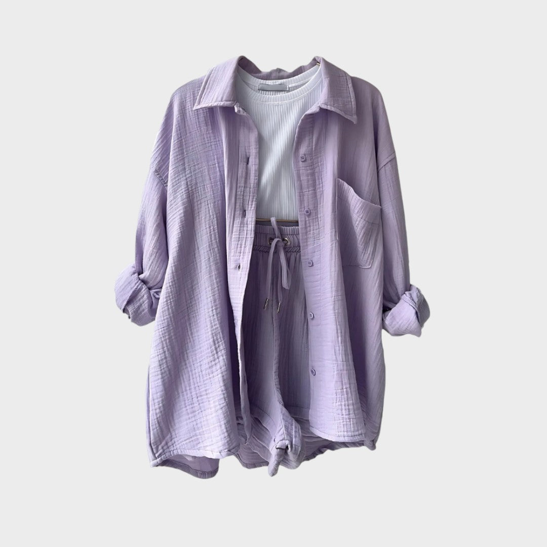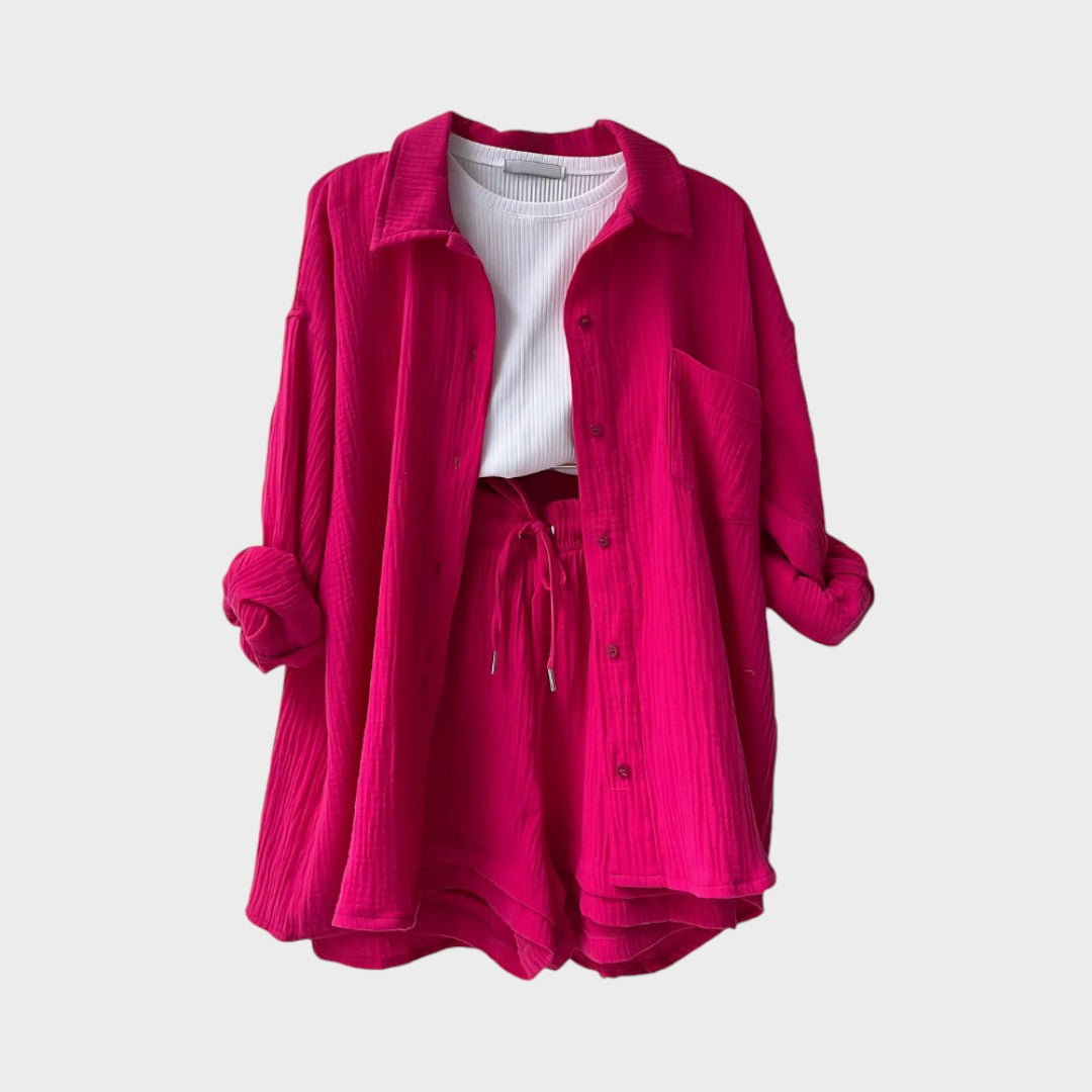 Ovaj svestrani ljetni set nudi savršeni balans između opuštenosti i stila. Sastoji se od lagane košulje i šortsa, idealnog za tople dane. Udoban, praktičan i uvijek u trendu, bit će vaš go-to outfit za casual izlaske, putovanja ili opuštanje kod kuće.