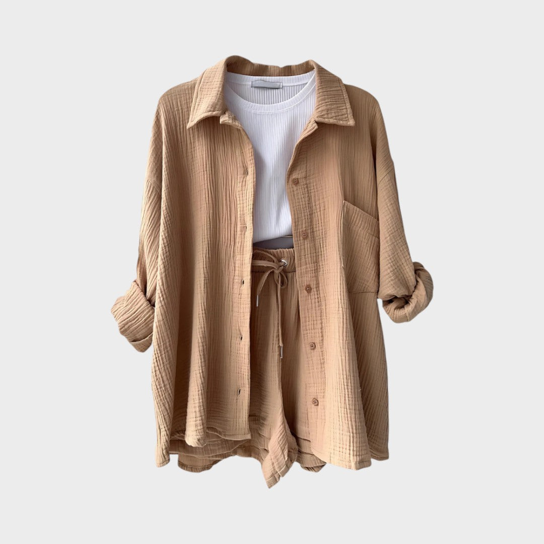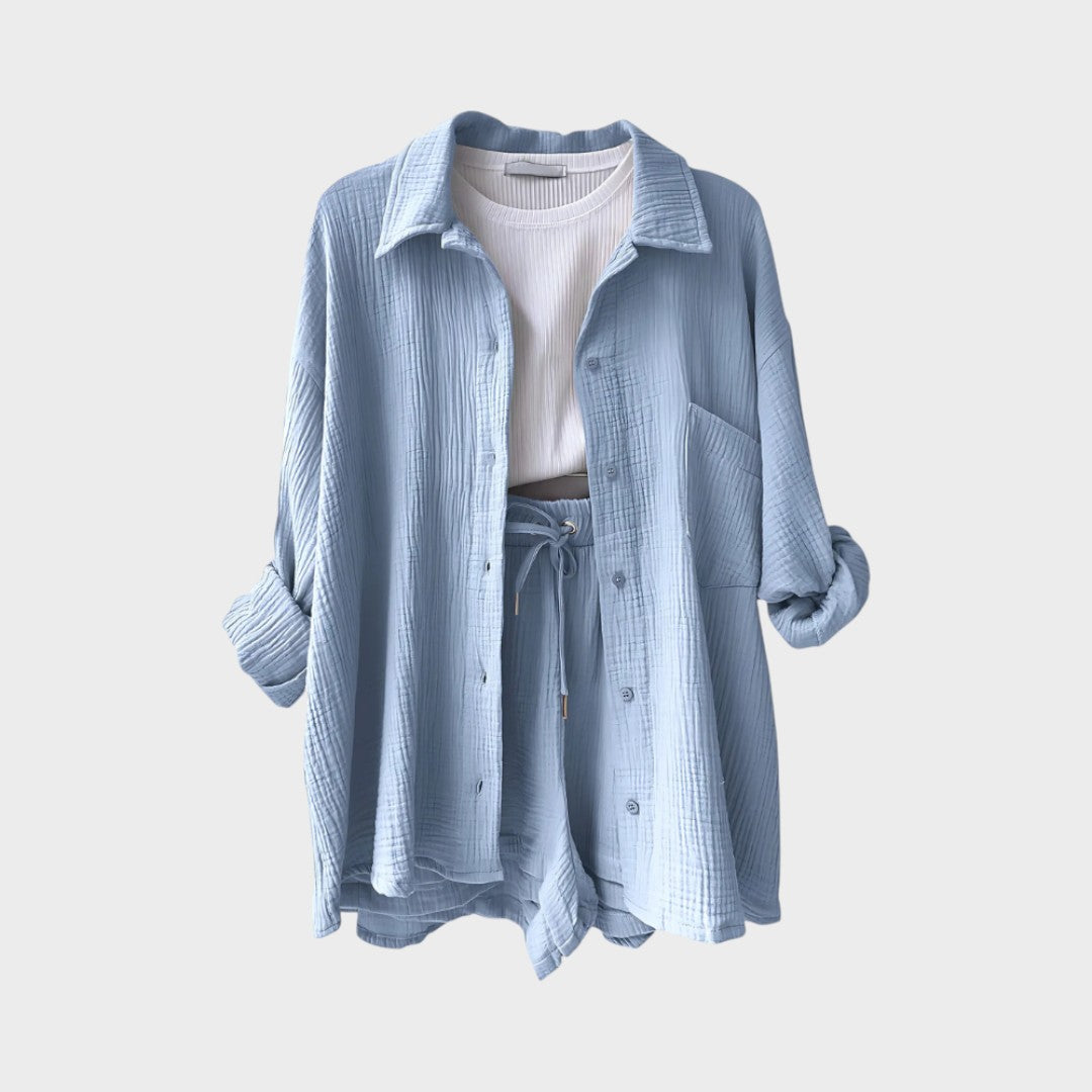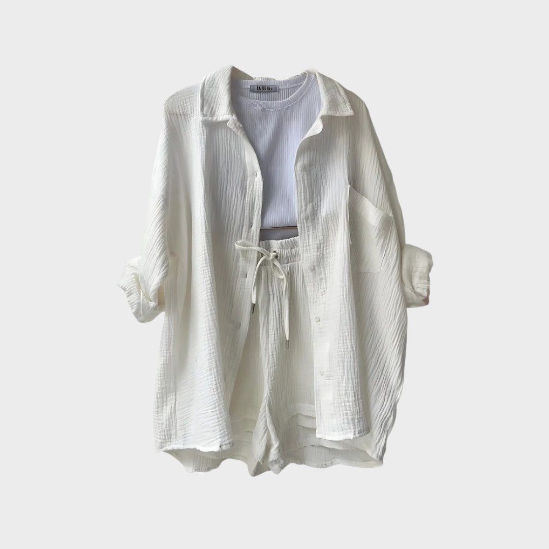 Ovaj svestrani ljetni set nudi savršeni balans između opuštenosti i stila. Sastoji se od lagane košulje i šortsa, idealnog za tople dane. Udoban, praktičan i uvijek u trendu, bit će vaš go-to outfit za casual izlaske, putovanja ili opuštanje kod kuće.