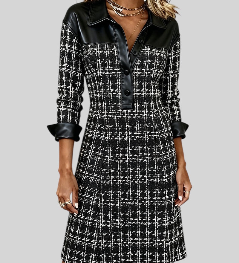 Ela | Haljina s dugim rukavima u patchwork i houndstooth uzorku
